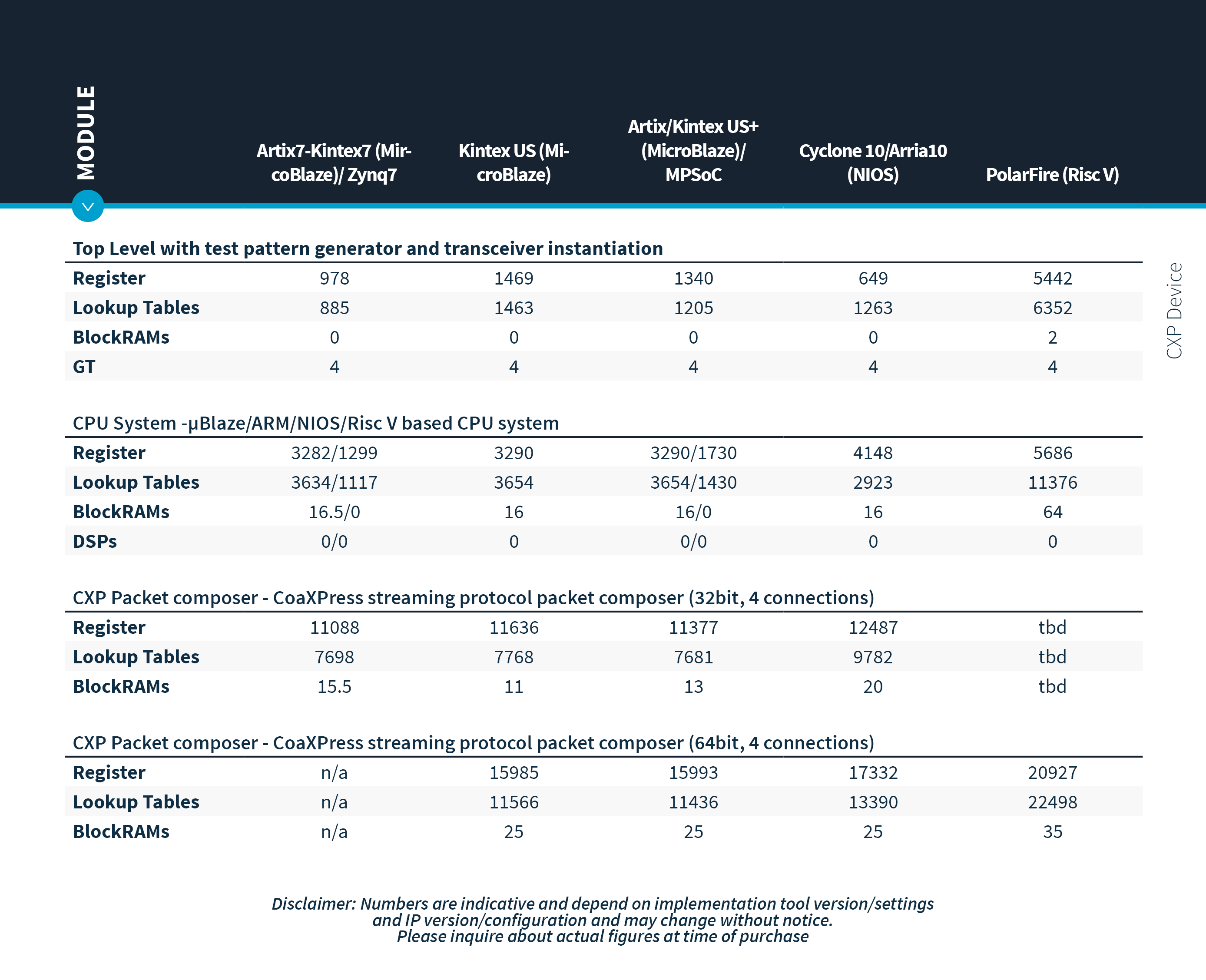 An FPGA integrated CPU (MicroBlaze, NIOS, ARM, Risc V) is used for several non-time-critical control and configuration tasks with the CXP-Device/Host core. This software is written in C and can be easily extended by the customer.